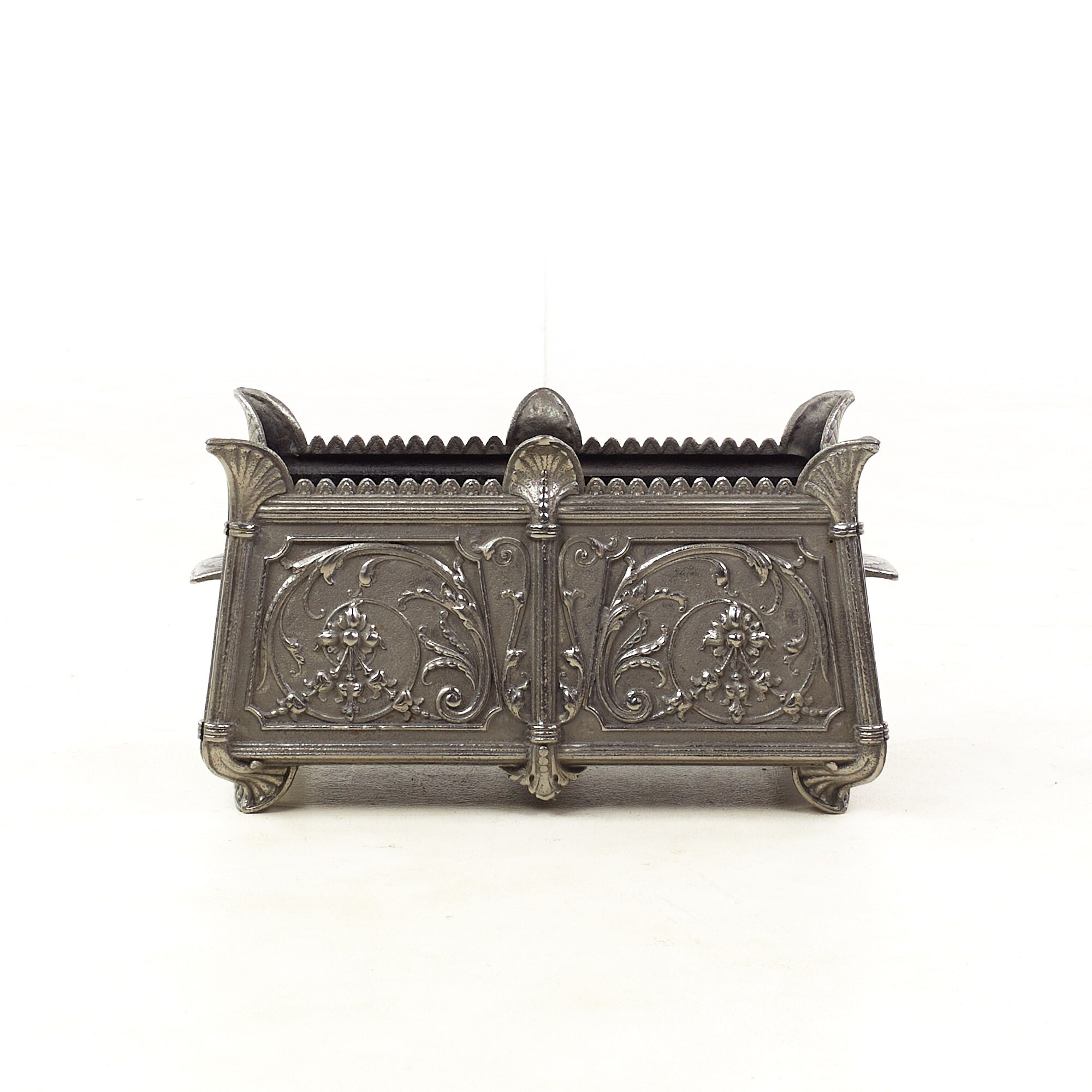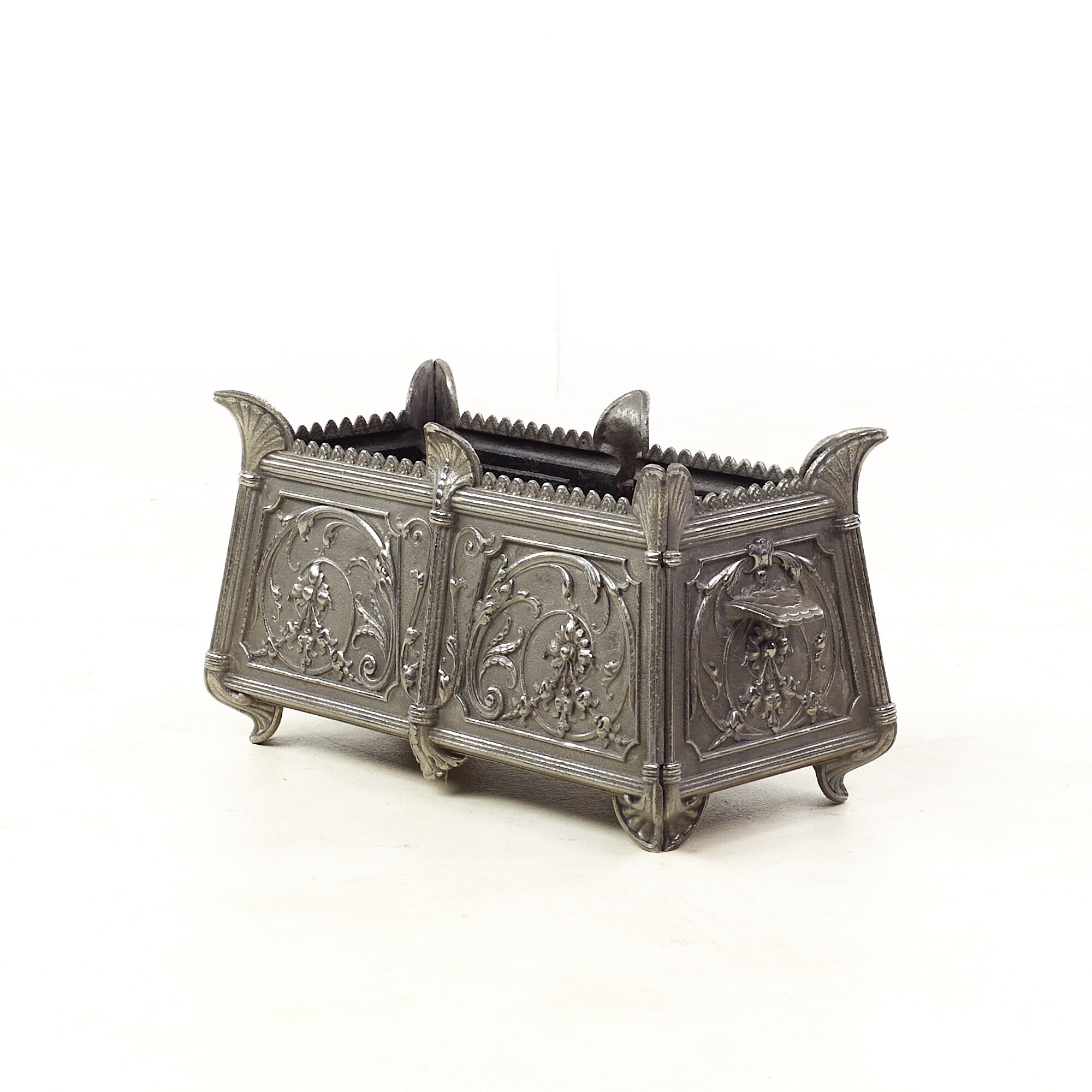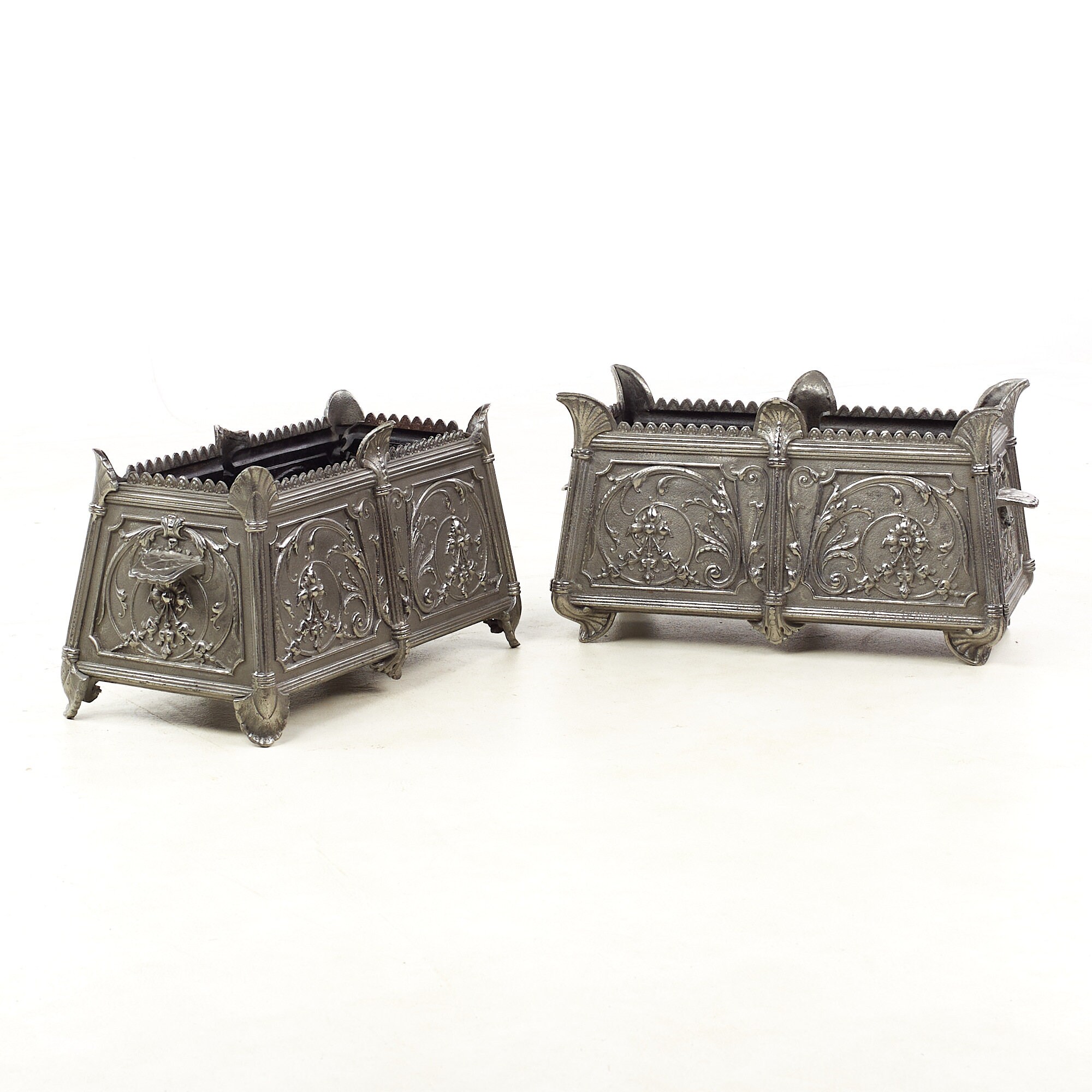 Each planter measures: 22 wide x 11 deep x 11 inches high and is in Good Vintage Condition with some rust and metal chips inside; a leaf is broken off on one planter
