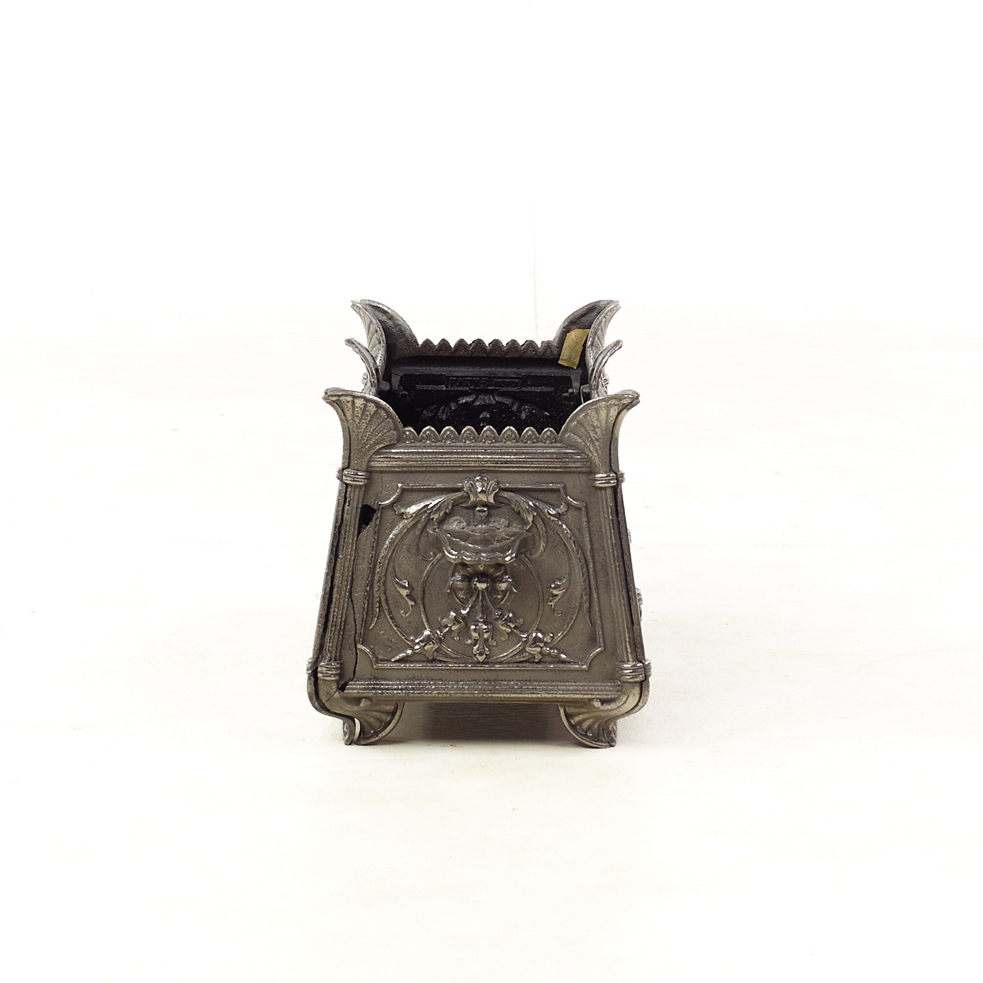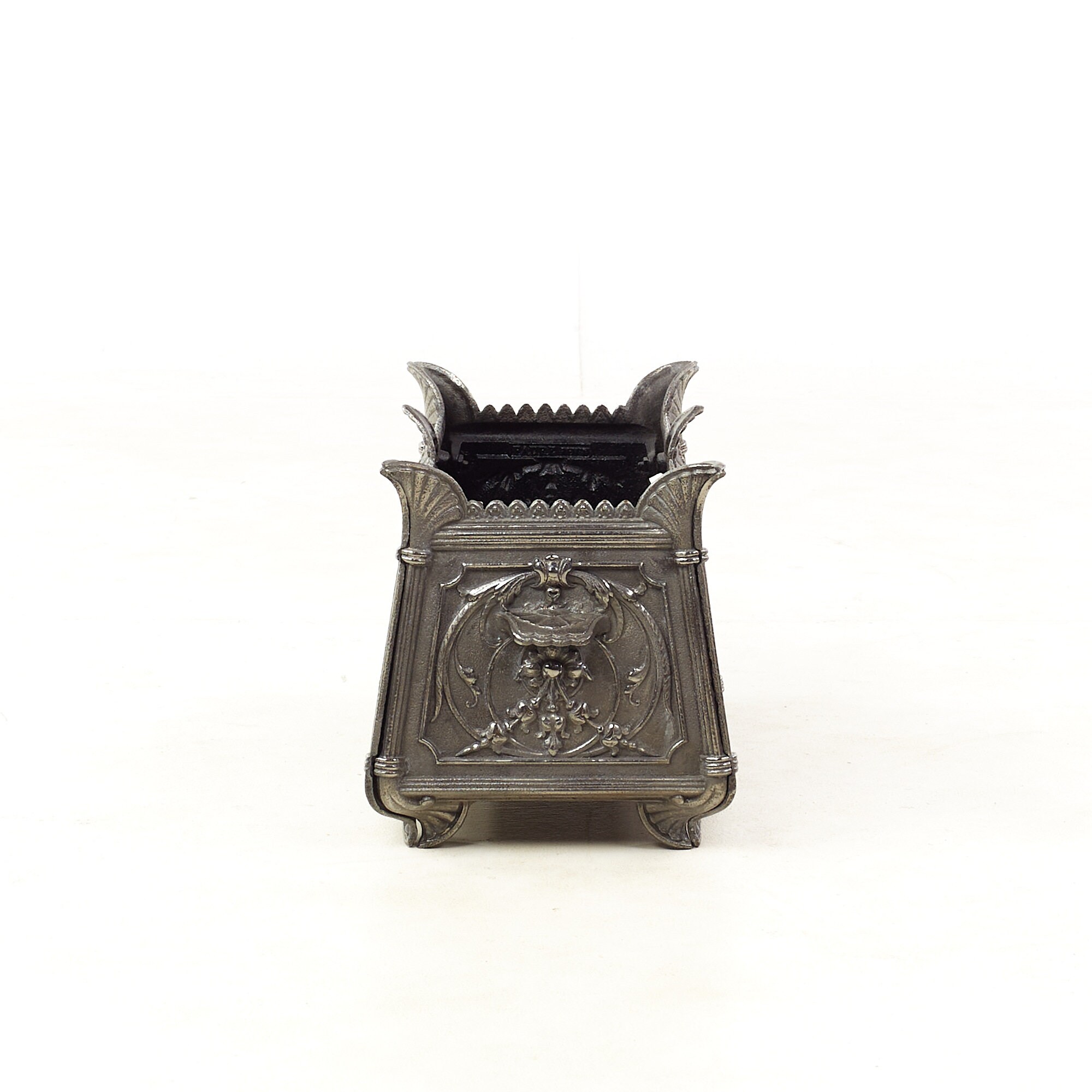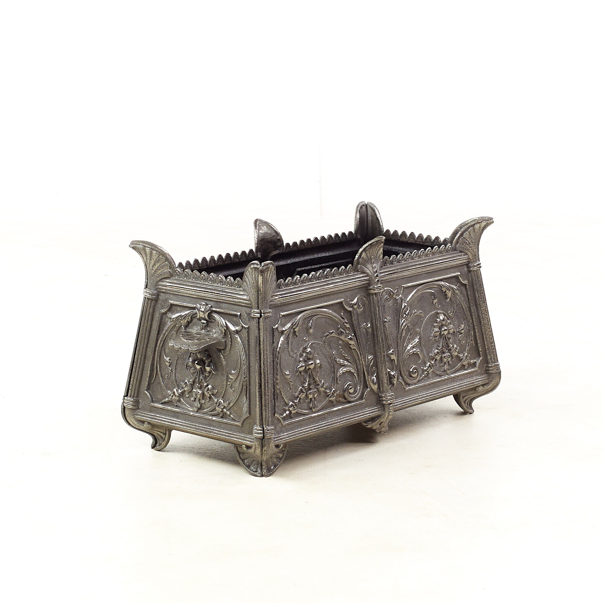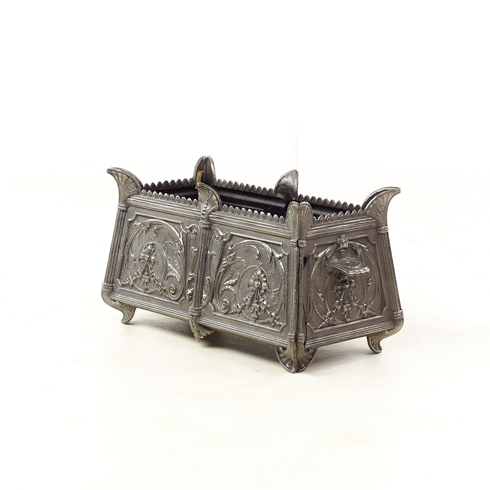 Each planter measures: 22 wide x 11 deep x 11 inches high and is in Good Vintage Condition with some rust and metal chips inside; a leaf is broken off on one planter